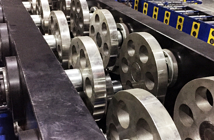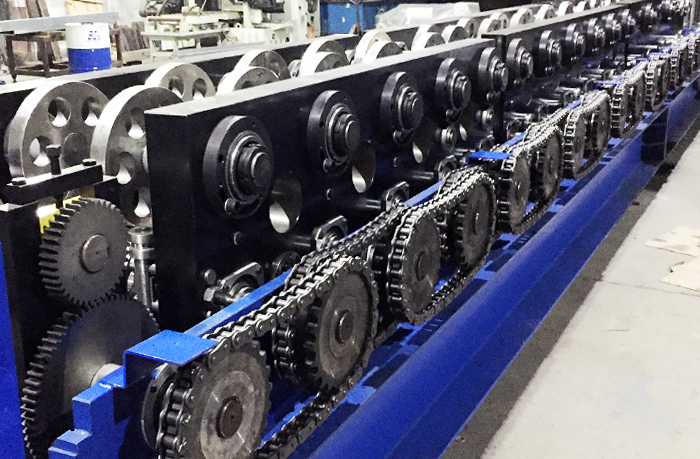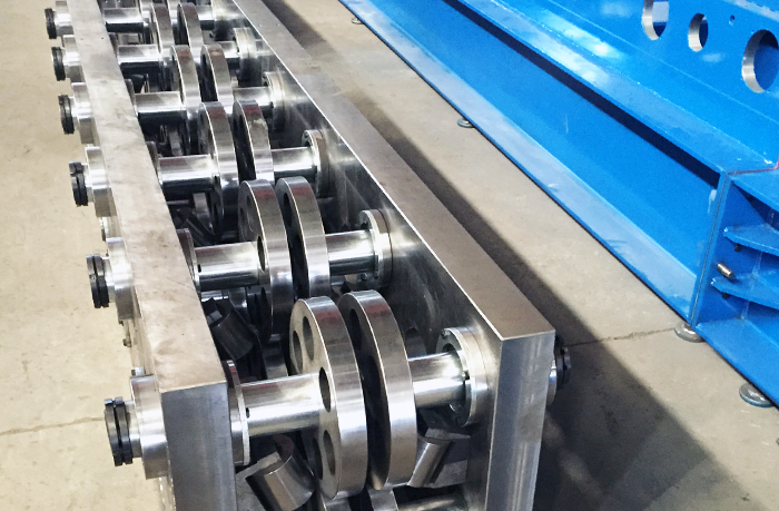 3、成型主机:机架用400B工字钢焊接而成,机组长度为12米,宽度为1.4米,高度为1.2米,整机重量为23吨。配光栅尺,采用数控调节规格方式,换型时间2分钟。轧制规格为宽度100-300mm,高度为40-100mm,压制板材质Q345,厚度为2.0-3.0mm,成型速度为35米/分,主机十六道滚压成型,轮子材料为Cr12MoV优质合金钢,淬火硬度为HRC60-62,辊轴材料为Ф75圆45#优质碳素钢,经调质处理,硬度为HRC28~32。