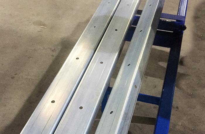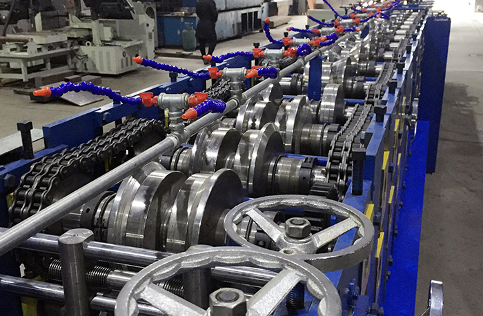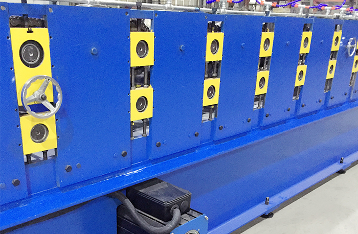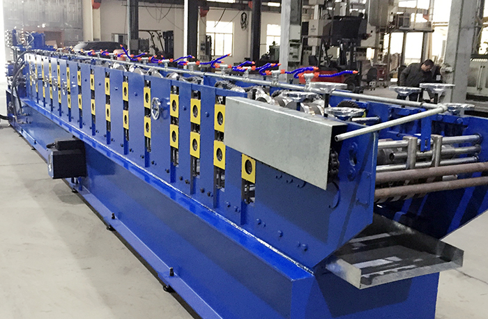 3、成型主机:机架用496H钢焊接而成,机组长度为9.2米,宽度为1.20米,高度为1.2米,整机重量为6.8吨,采用隔套式手动调节规格方式,换模时间15-20分钟。轧制规格为宽度50-120mm,高度为40-60mm,厚度为2.0-3.0mm,不打孔成型速度为40米/分,主机十三道滚压成型,轮子材料为Cr12MoVi优质合金火硬度为HRC60-62,辊轴外径为Φ78圆,辊轴材料为45#优质碳素钢。轴经调质处理HRC28-32。